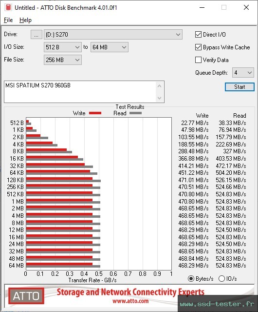 Ici, un fichier de 256 Mo est écrit plusieurs fois sur le support de stockage. La taille des blocs d’E/S est alors variable (de 512 octets à 64 mégaoctets). Plus les blocs sont grands, plus la lecture et l’écriture sont rapides.